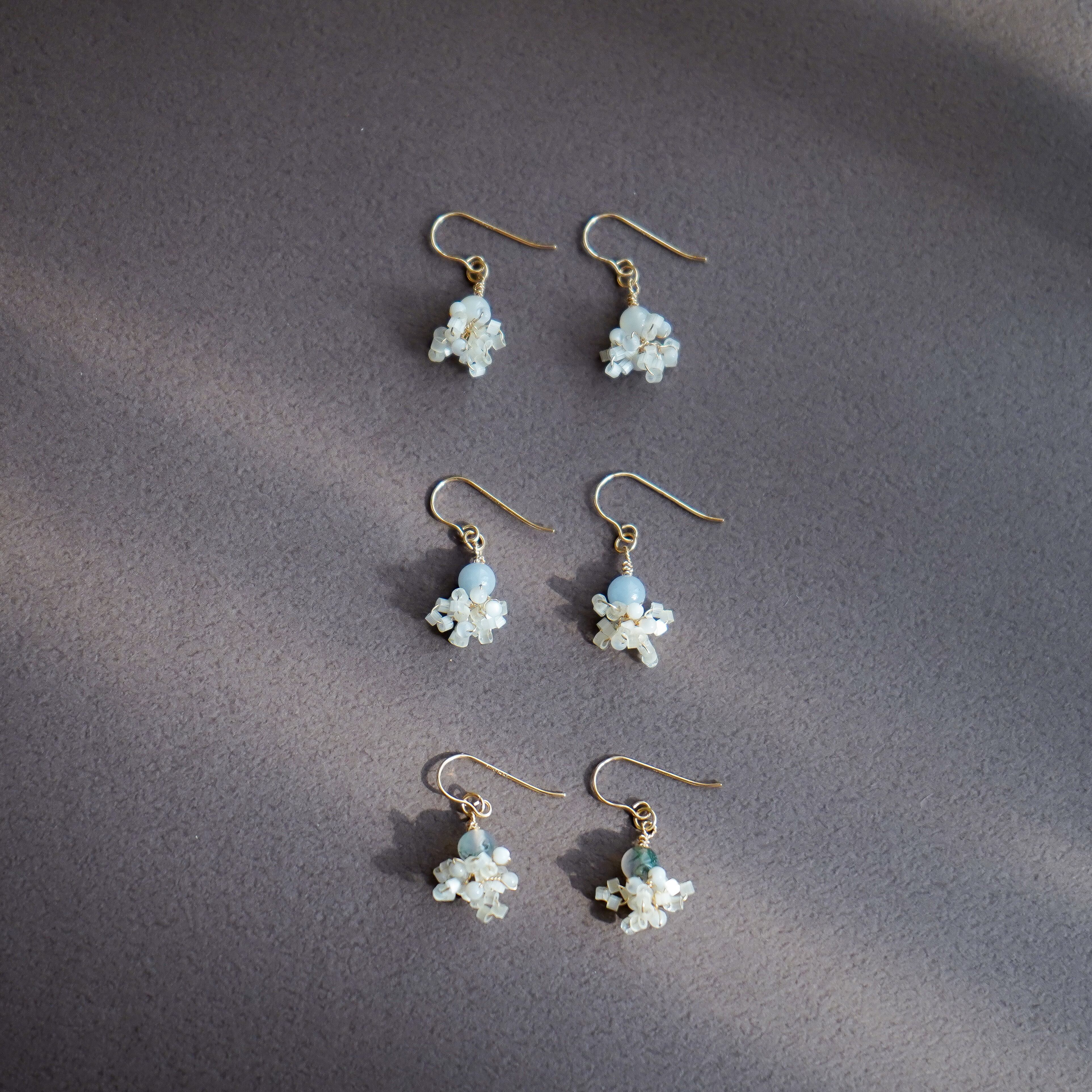 木漏れ日の光のようなホワイトシェル、青空のようなエンジェライト、森の中をそよぐようなモスアゲート。