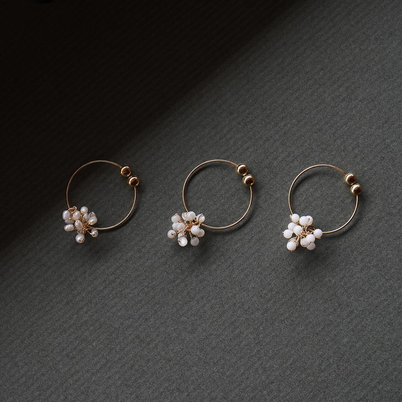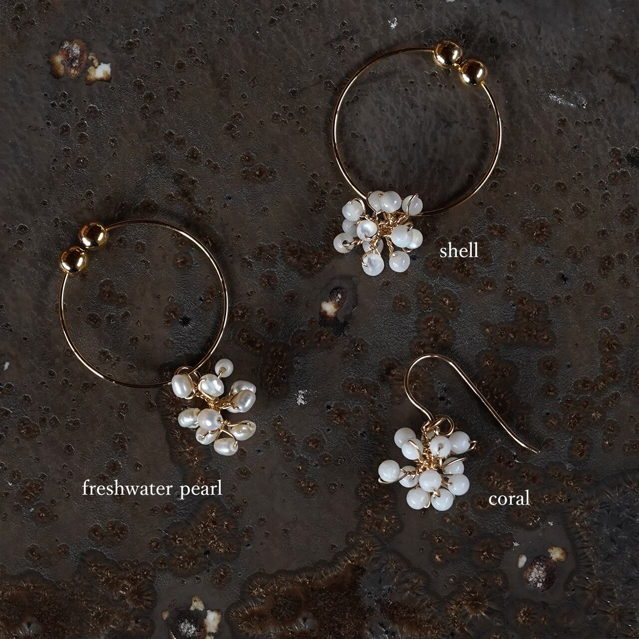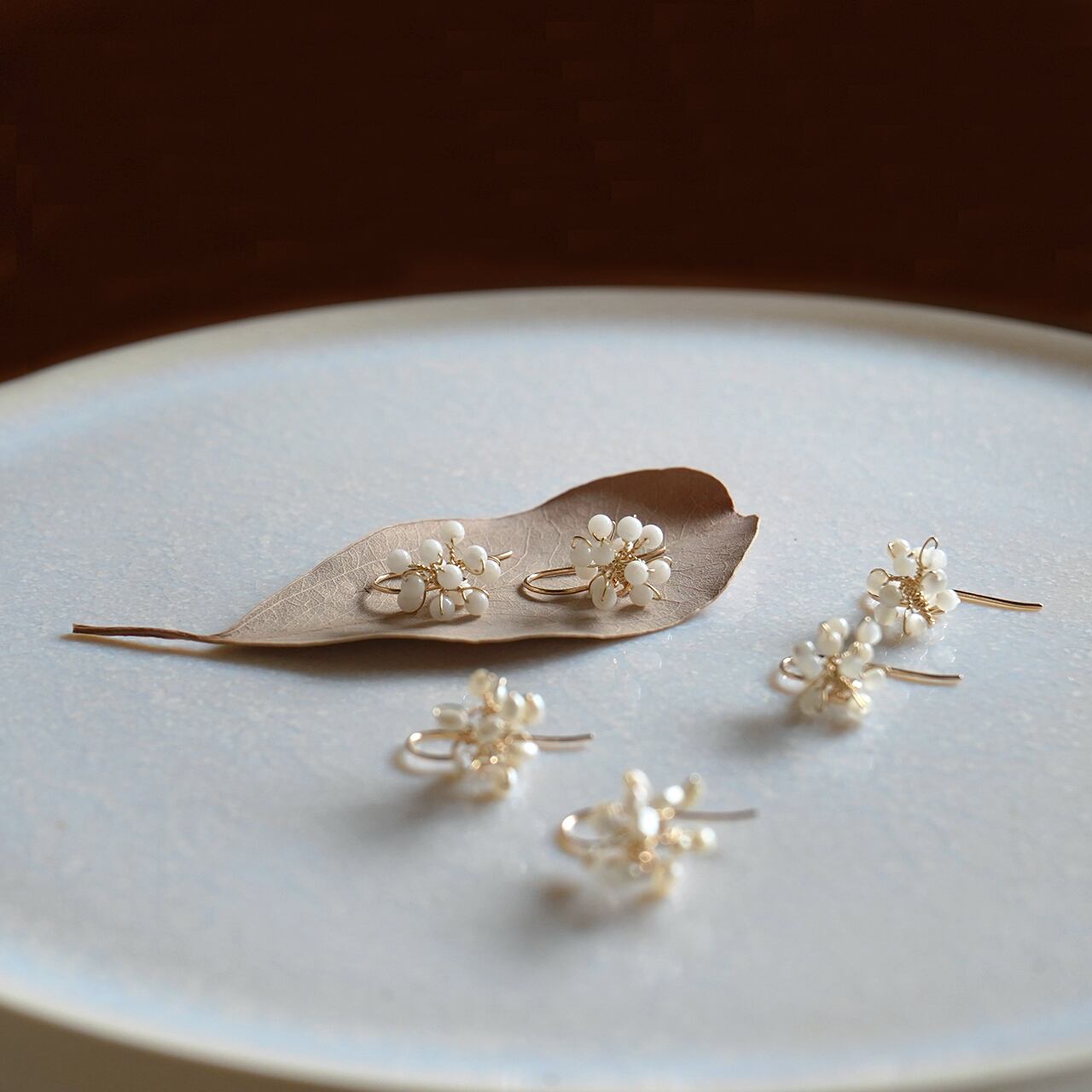 「スノーベリー」の実をモチーフに、ホワイトシェル(白蝶貝)で仕立てた耳飾りです。