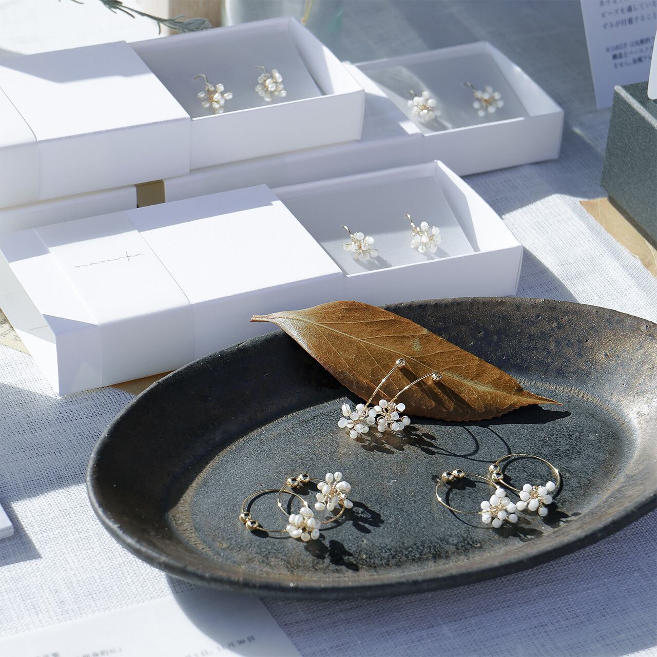 ・金具やビーズのメッキ部分などは汗や水、石鹸などでどうしても酸化してしまいます。ご着用後は乾いた布やテュッシュペーパーなどで優しく拭いていただくとより長くご使用いただけます。