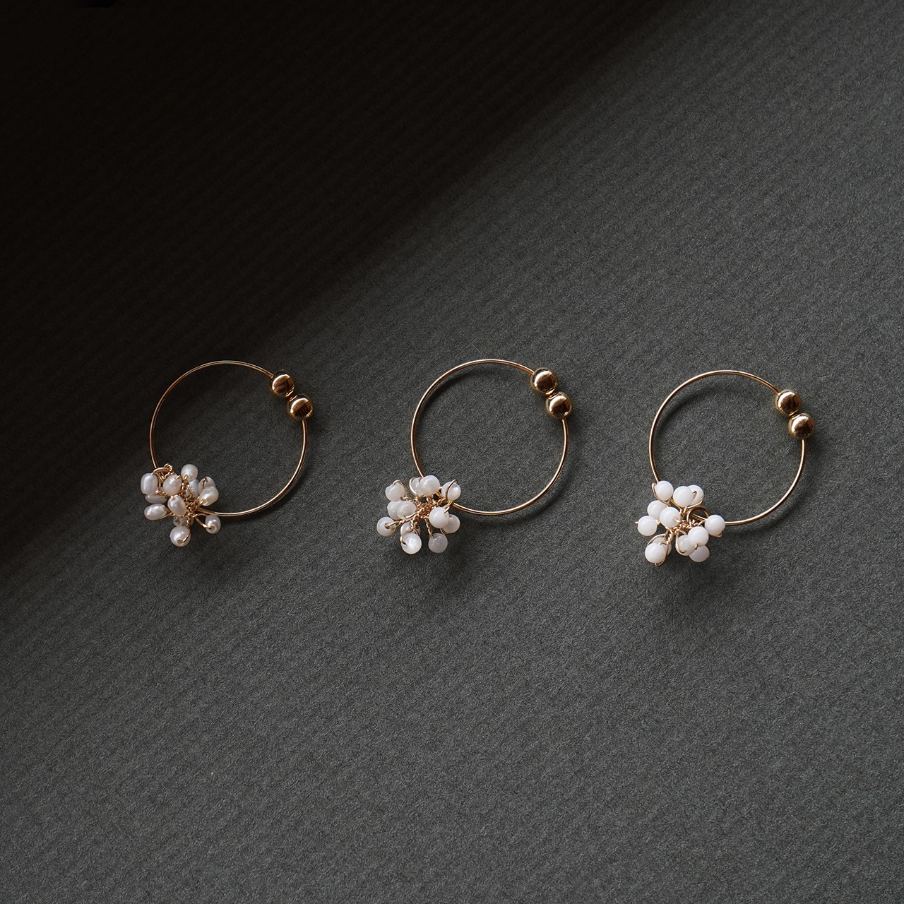 ホワイトシェル(白蝶貝)はアイボリーの優しい色合いと照りが美しい、見ているとおおらかな海に癒されているかのような気持ちになれる耳飾りです。