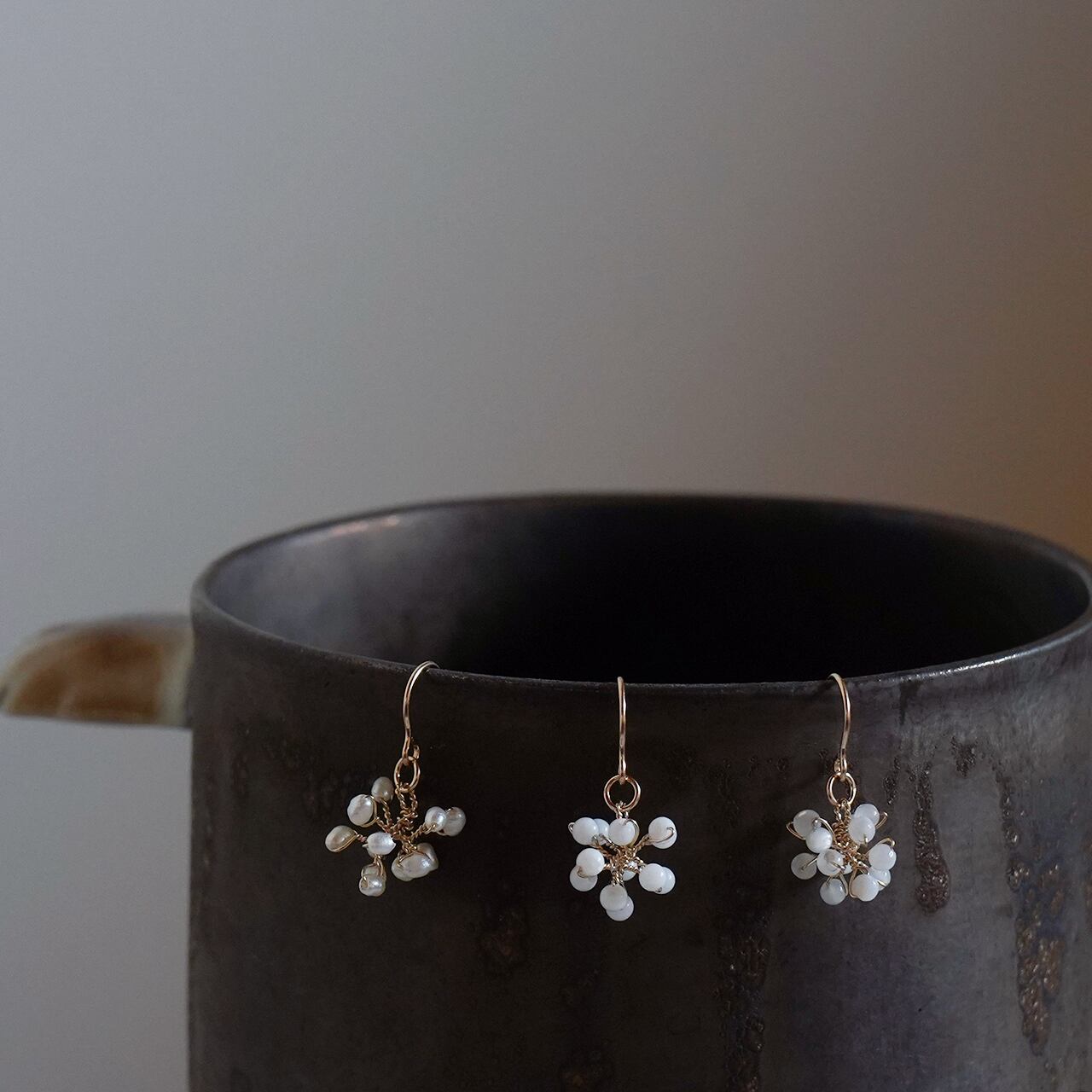 ホワイトコーラルのミルキーホワイトは、植物のスノーベリーにとても似ています。上品なツヤ感に魅せられる耳飾りです。