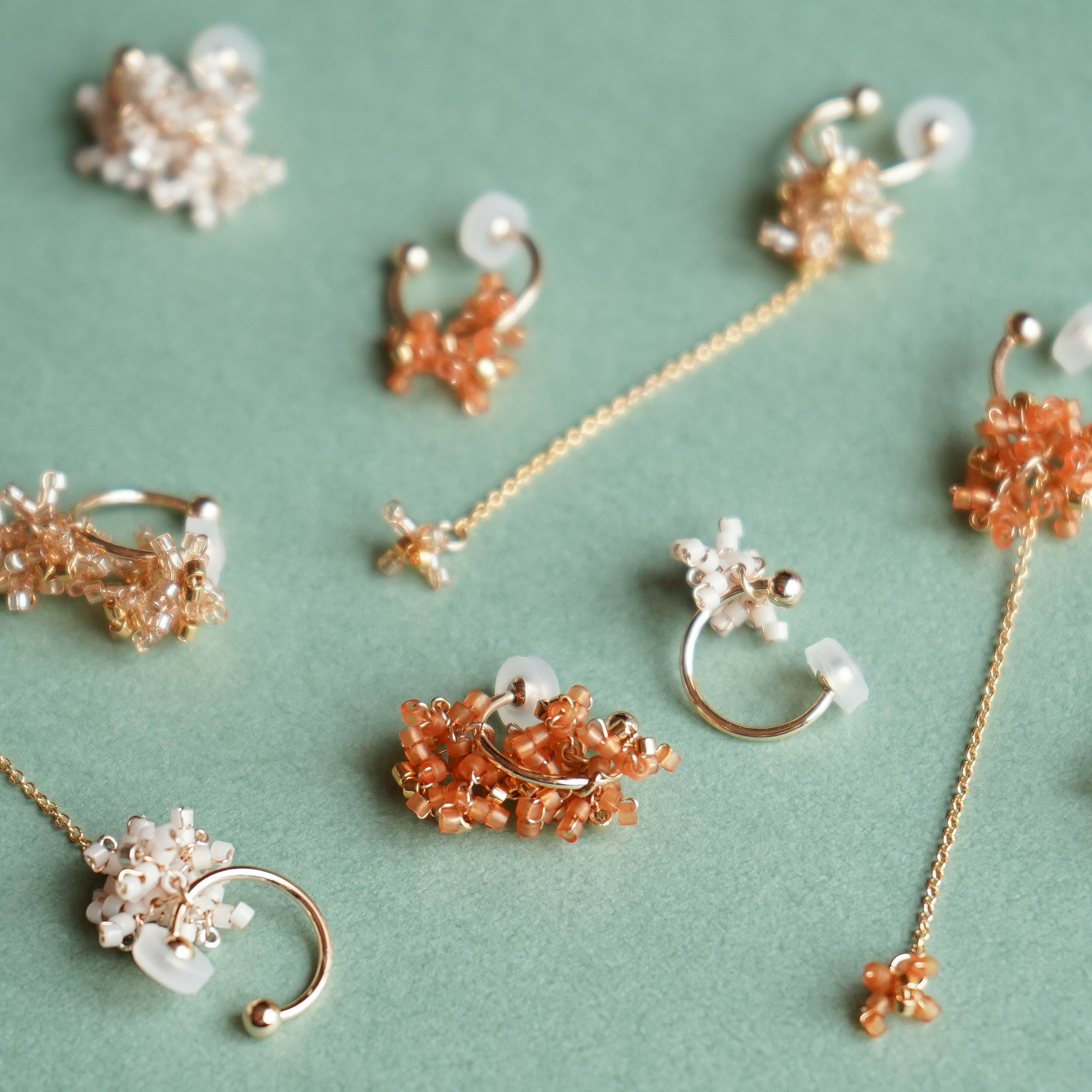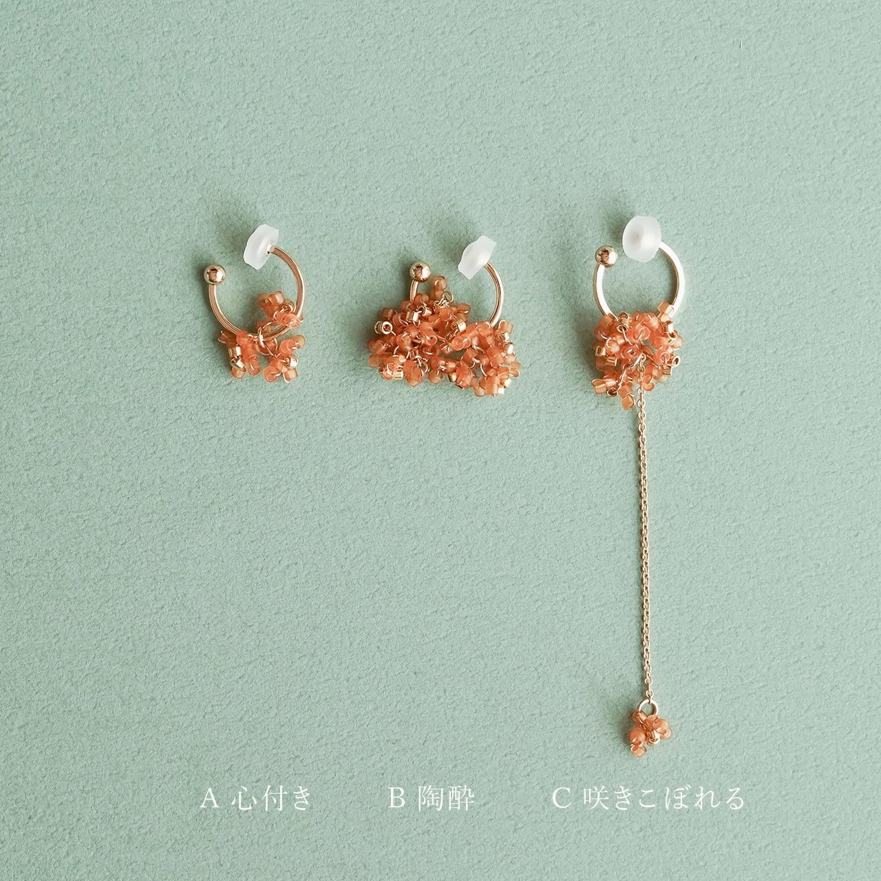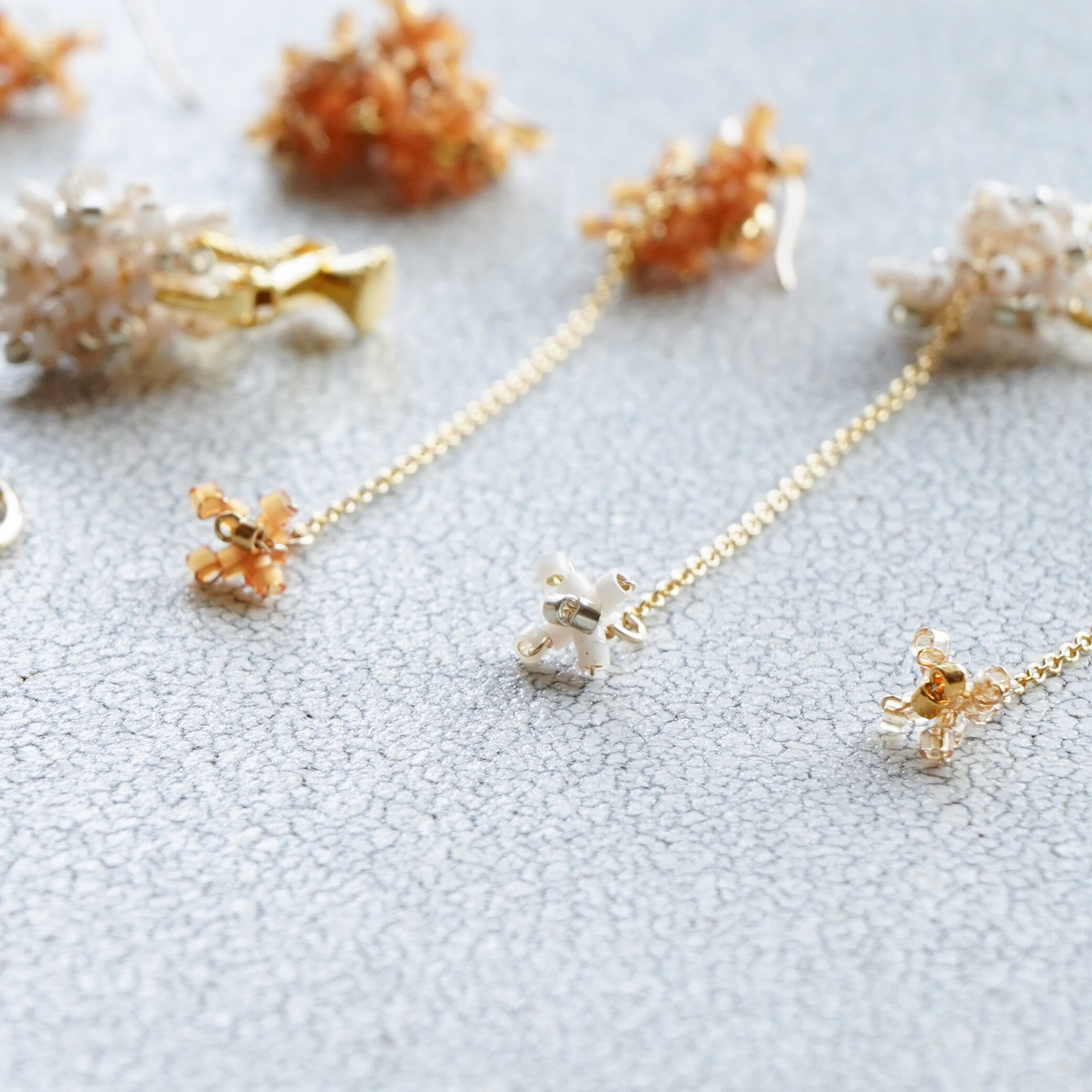 その金木犀の花弁をビーズでかたどって、耳元でささやかに揺れる3つのデザインで表現しました。